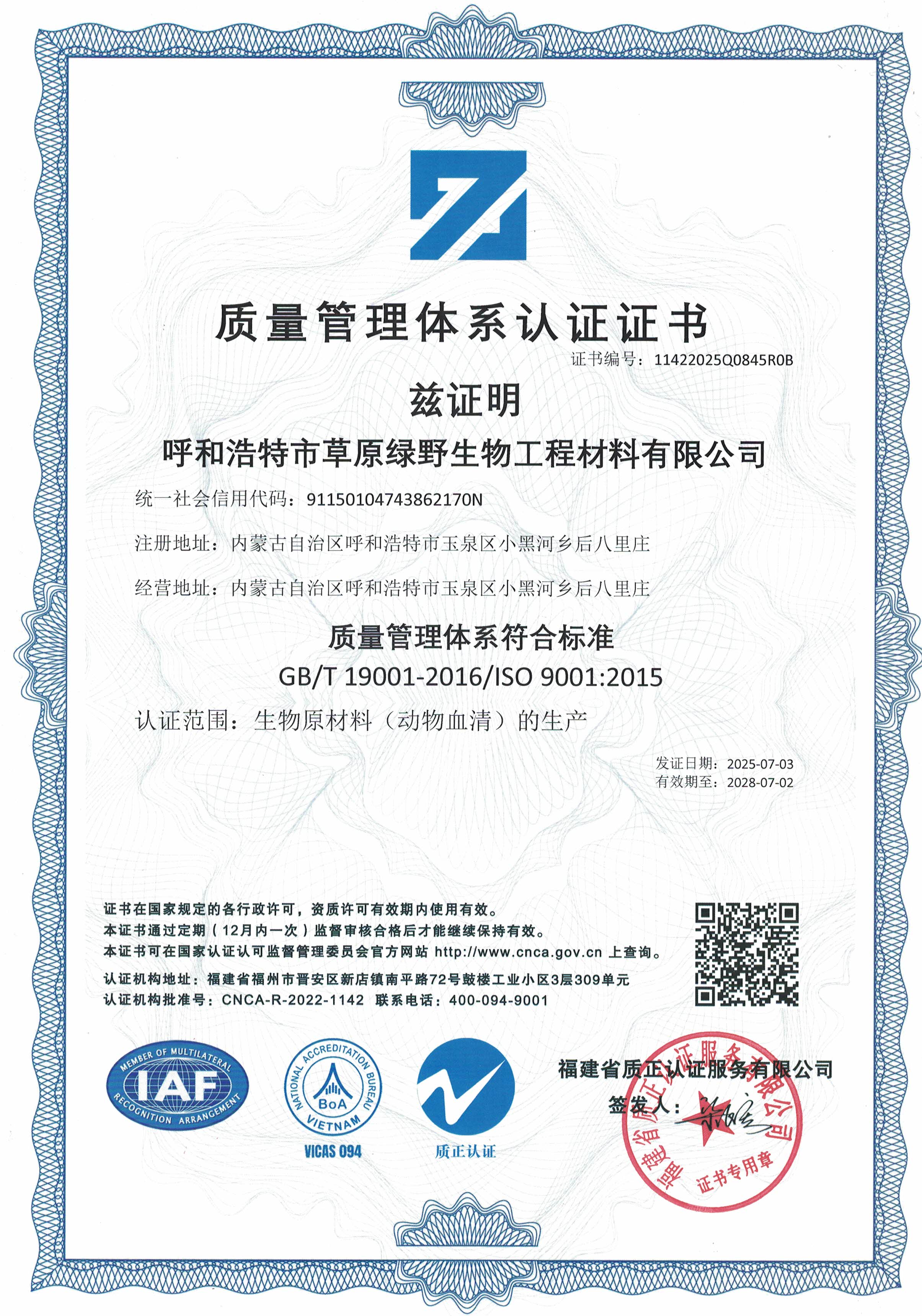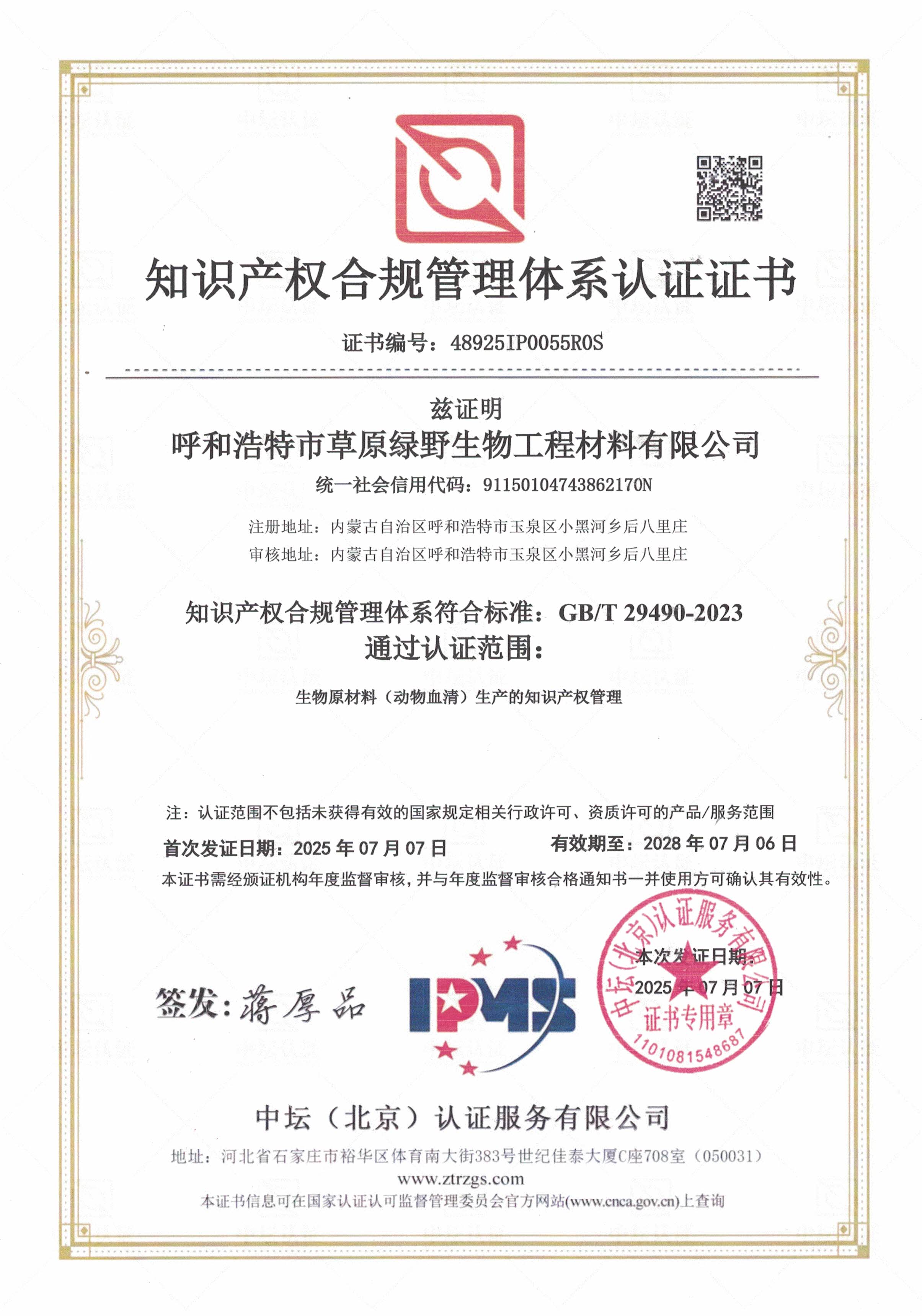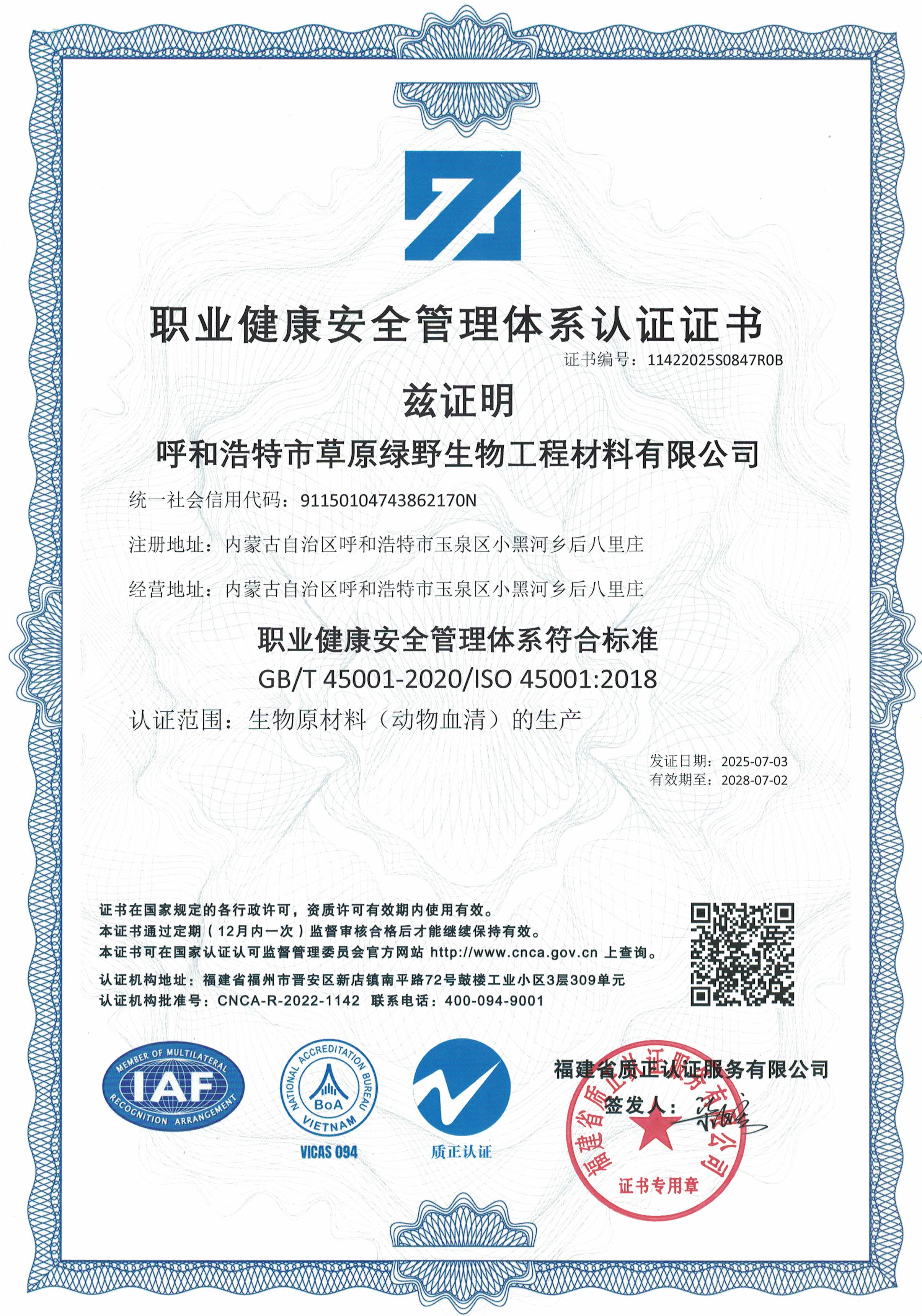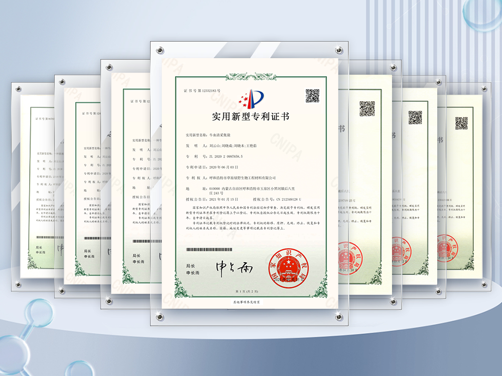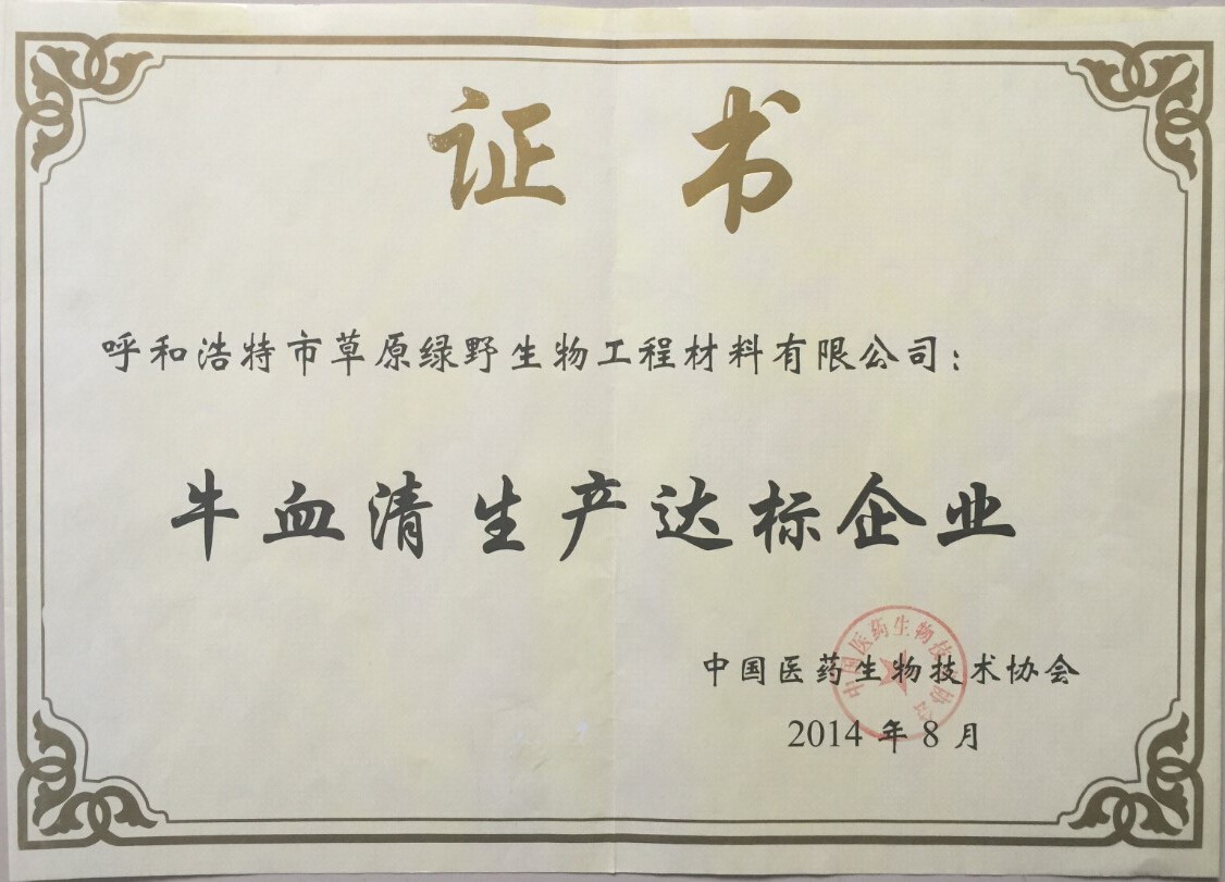 公司至今已多次通過中國醫(yī)藥生物技術(shù)協(xié)會《牛血清生產(chǎn)企業(yè)達標》認證、《牛血清生產(chǎn)質(zhì)量達標企業(yè)》認證。ISO9001質(zhì)量管理體系認證、ISO45001職業(yè)健康安全管理體系認證、ISO14001環(huán)境管理體系認證、ISO13485醫(yī)療器械質(zhì)量管理體系認證、ISO50001能源管理體系認證、GB/T29490知識產(chǎn)權(quán)合規(guī)管理體系認證、AAA級信用企業(yè)認證、A級納稅單位評審等。